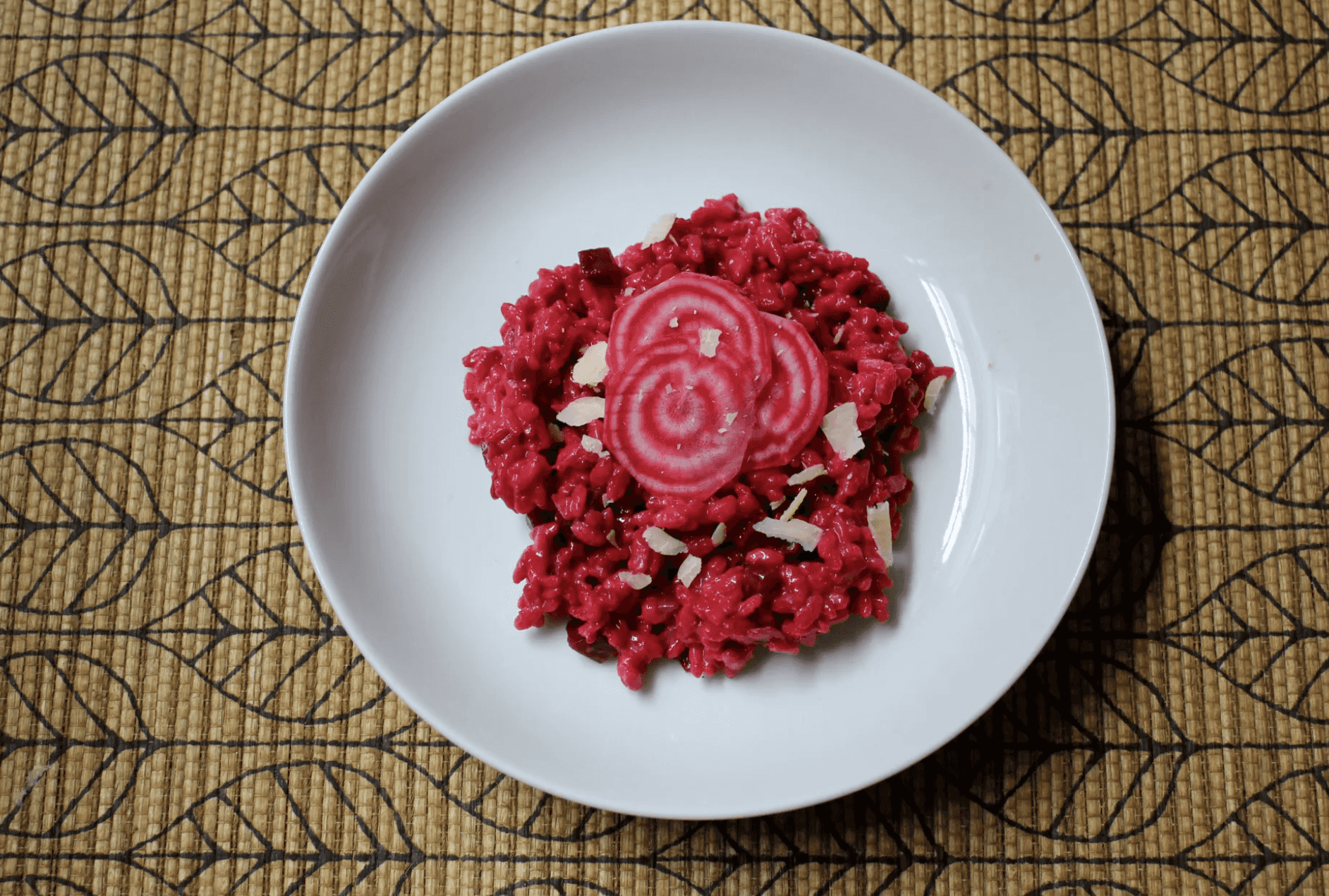 In a medium saucepan heat the broth and wine until steaming. In a large saucepan melt the butter over medium heat. Add the onion and cook until tender and translucent, about 5 minutes. Add the garlic and cook and stir one minute more. Add the rice and cook and stir for a minute or two or until the rice is coated in the butter and starting to turn a little translucent around the edges. Add a ladle of the hot broth and wine a little at a time. Stir the rice with a wooden spoon until all the broth is absorbed. Continue adding a little broth at a time, stirring and allowing the liquid to be absorbed before adding more. The rice should still have a little bite to it. Stir in the chopped beets and the Parmesan. Add salt and pepper to taste. Serve topped with more Parm and a few super-thin slices of fresh beets if you’re feeling fancy.